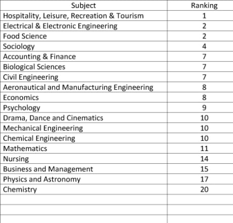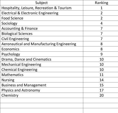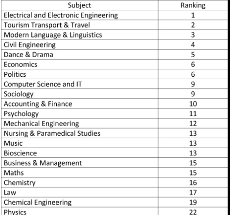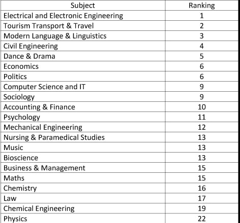 Three subject areas received 100 per cent satisfaction ratings. Programmes within seven other subject categories ranked in the national top ten.